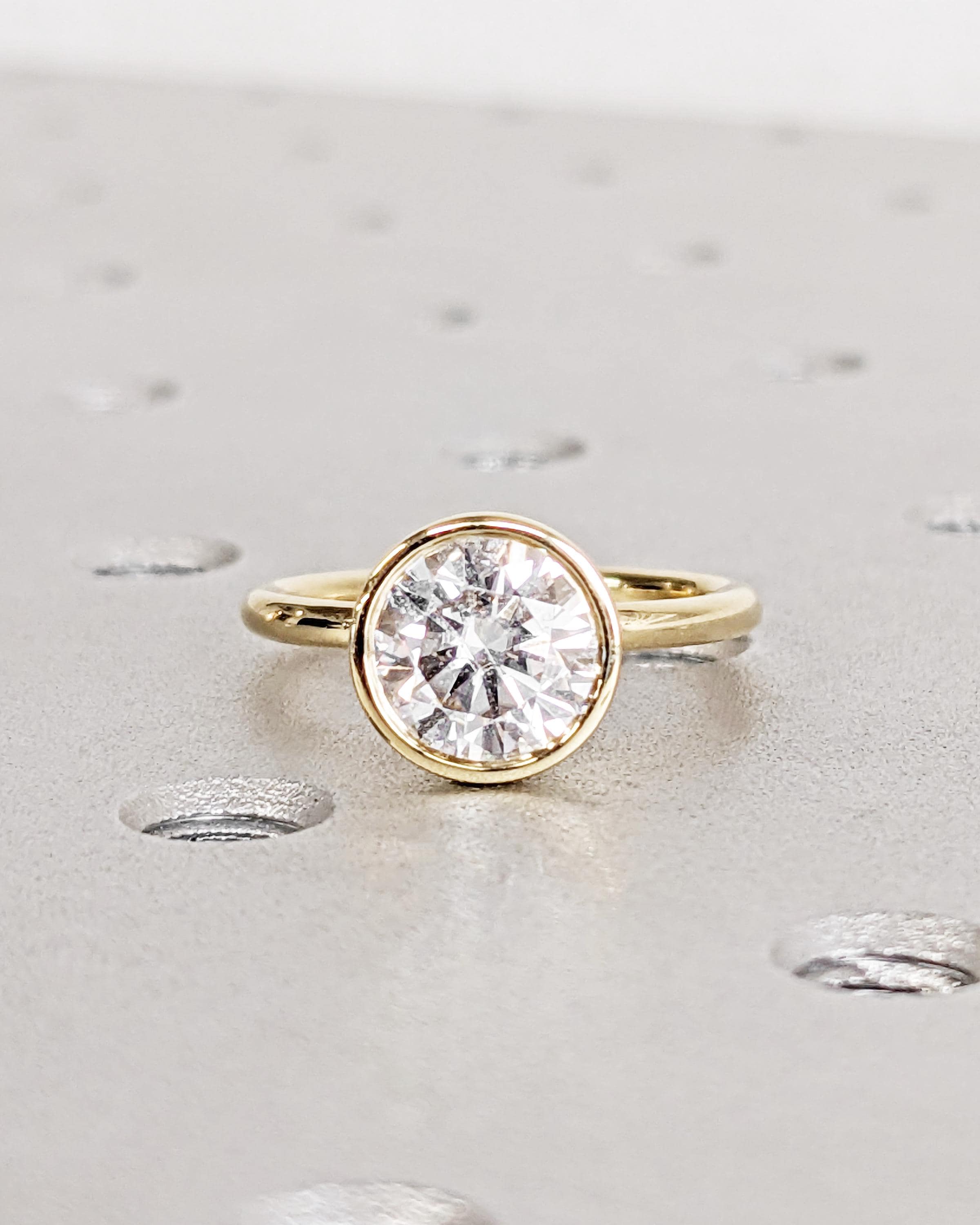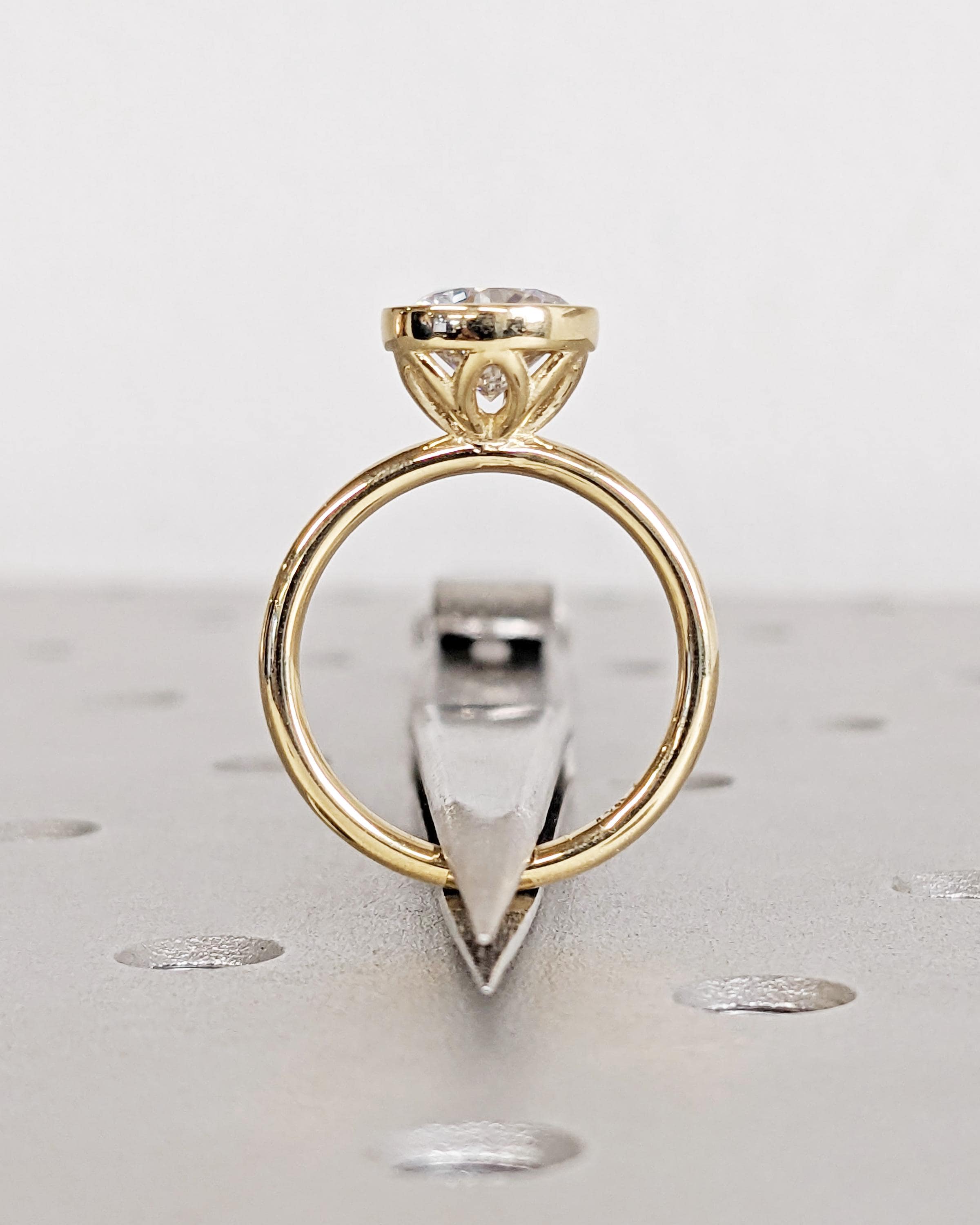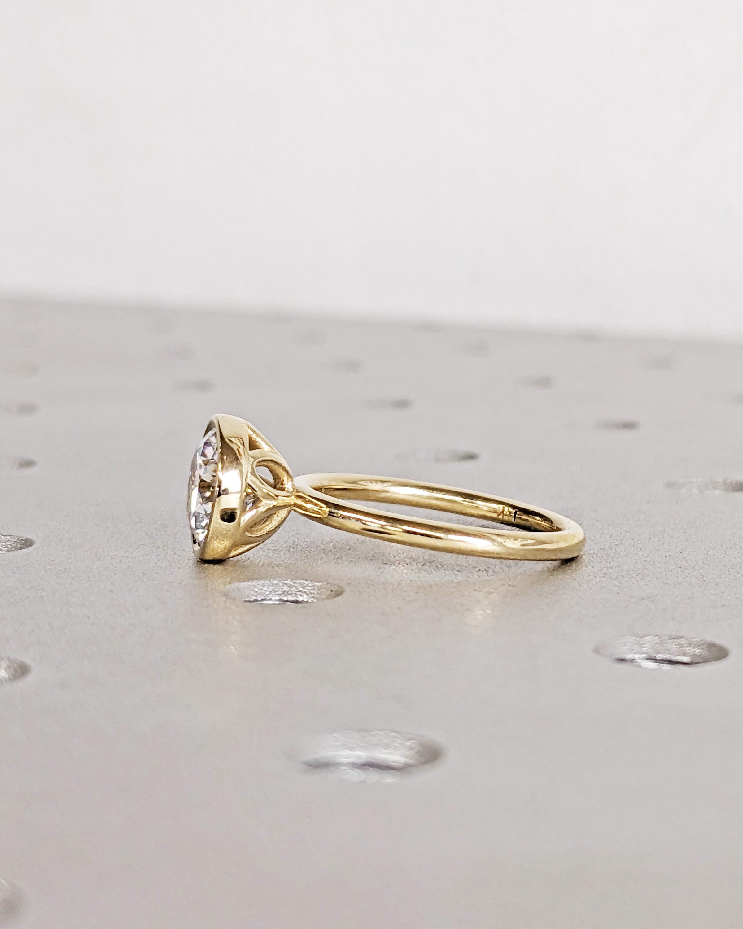 Our bezel set moissanite engagement ring brings together clean lines and delicate floral charm. The round cut center stone shines brightly above a tulip or lotus petal basket, adding a soft floral touch that makes the ring feel extra romantic. A timeless solitaire design, perfect for everyday elegance.