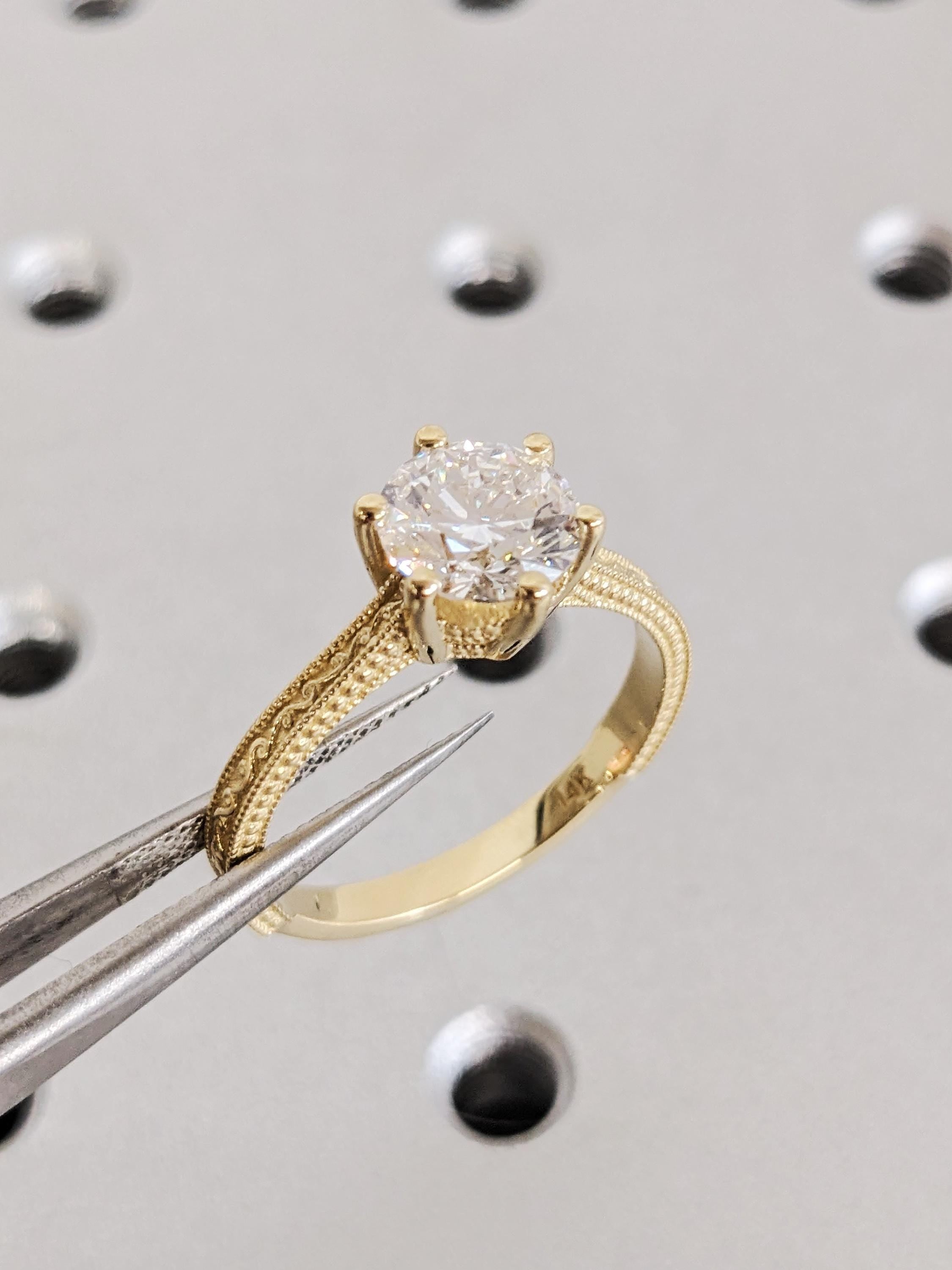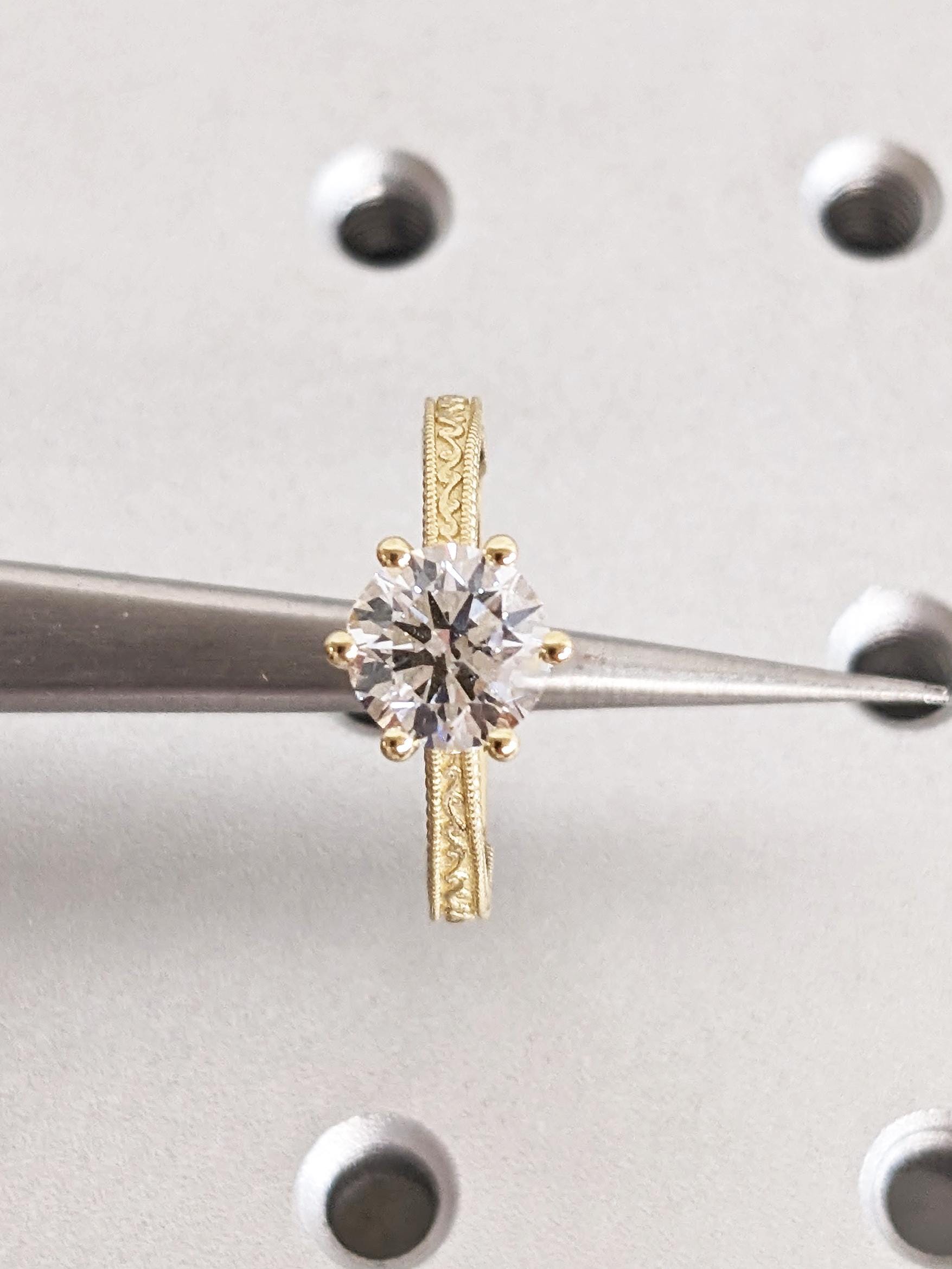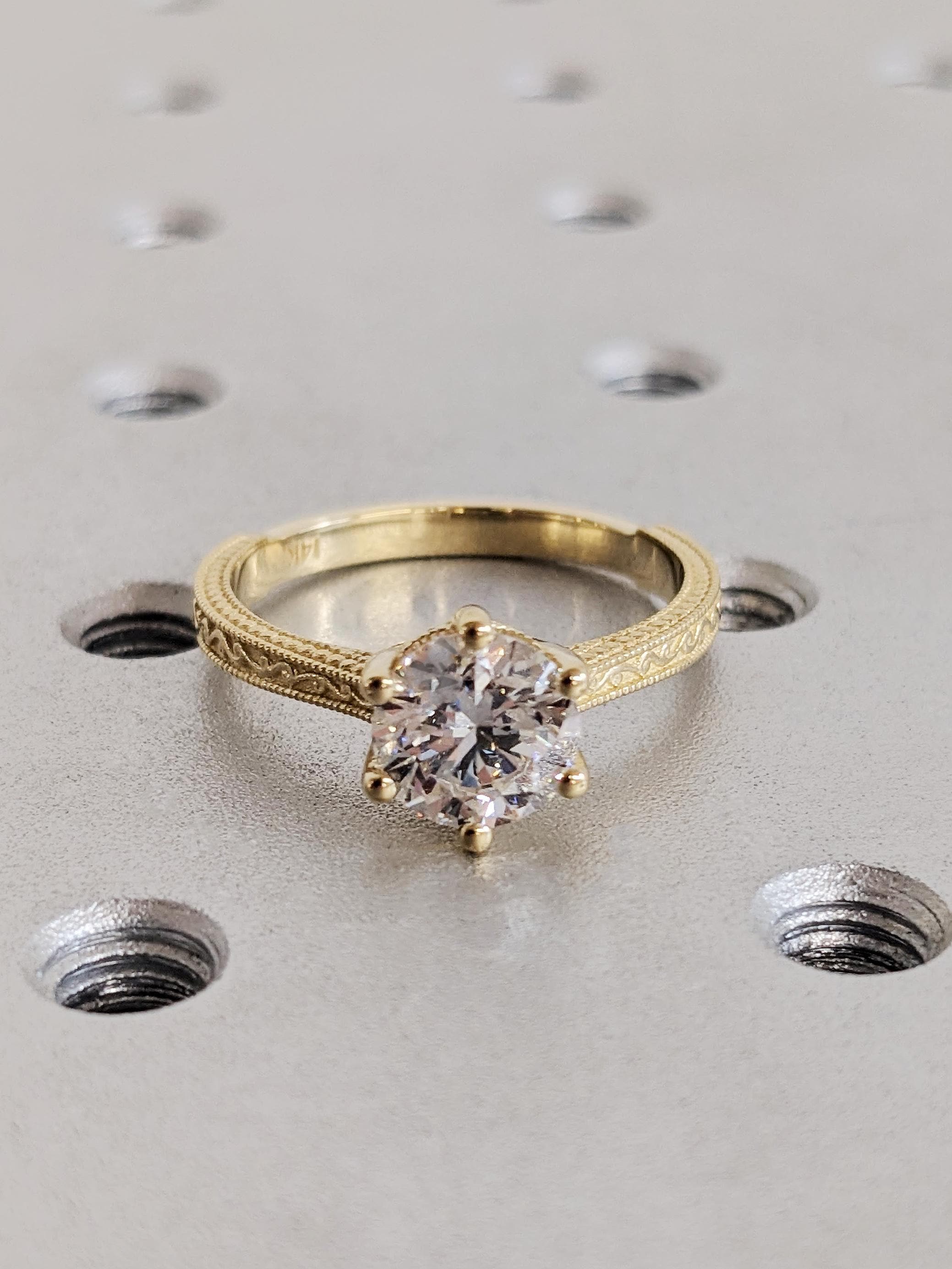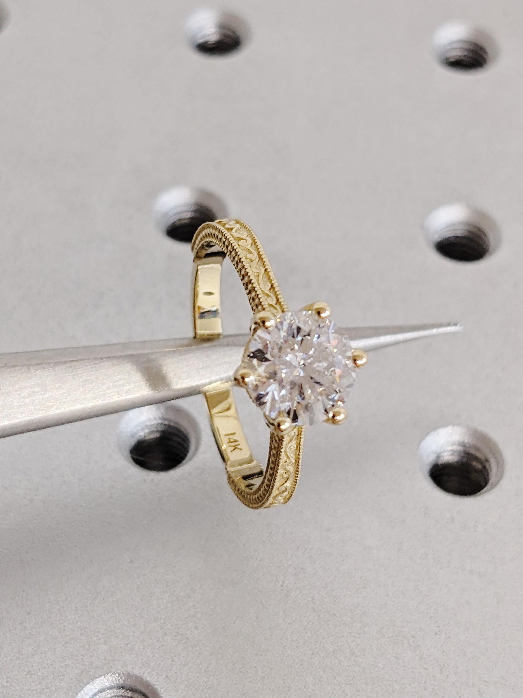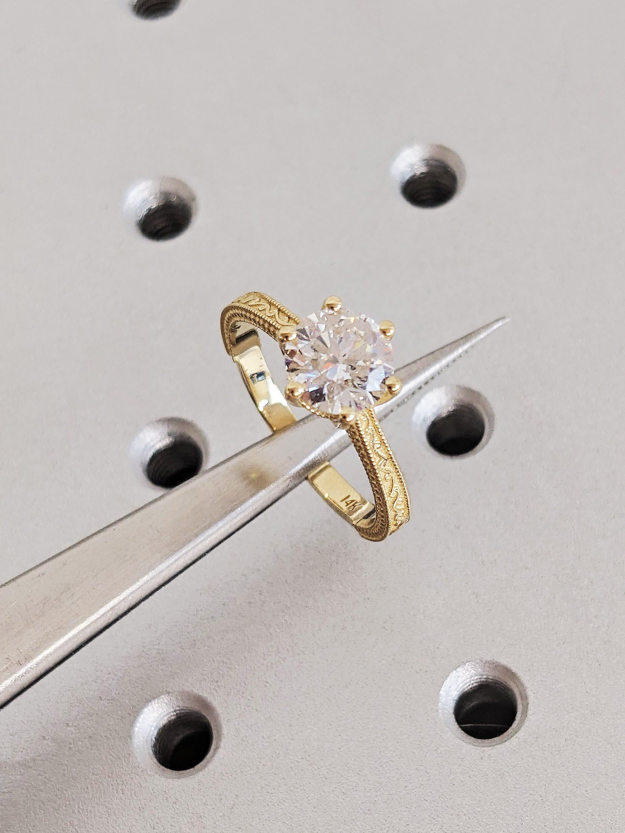 This beautiful heirloom worthy ring features a round cut Moissanite solitaire, sets on a high setting basket with engraved gallery rail. Hand carved with flowing vines and milgrain edged on its tapered band, this regal and timeless statement piece makes a wonderful addition to your jewelry collection.