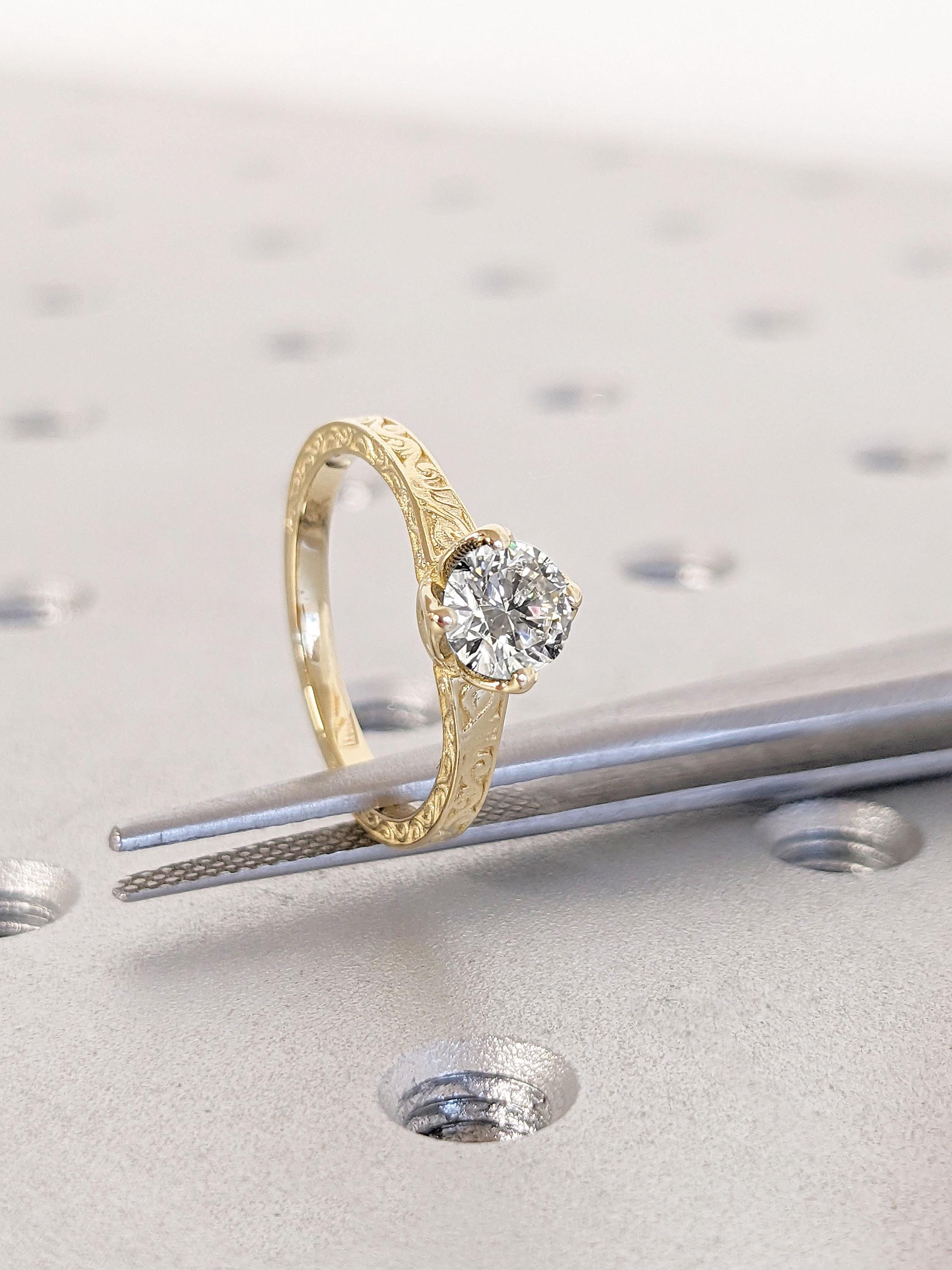 Enchanting and timeless, our vintage-inspired engagement ring features a captivating round cut Moissanite. Nestled in a secure flower basket setting on a square-shaped band, the ring is embellished with exquisite undulating wave filigree, creating a perfect representation of your enduring love story.