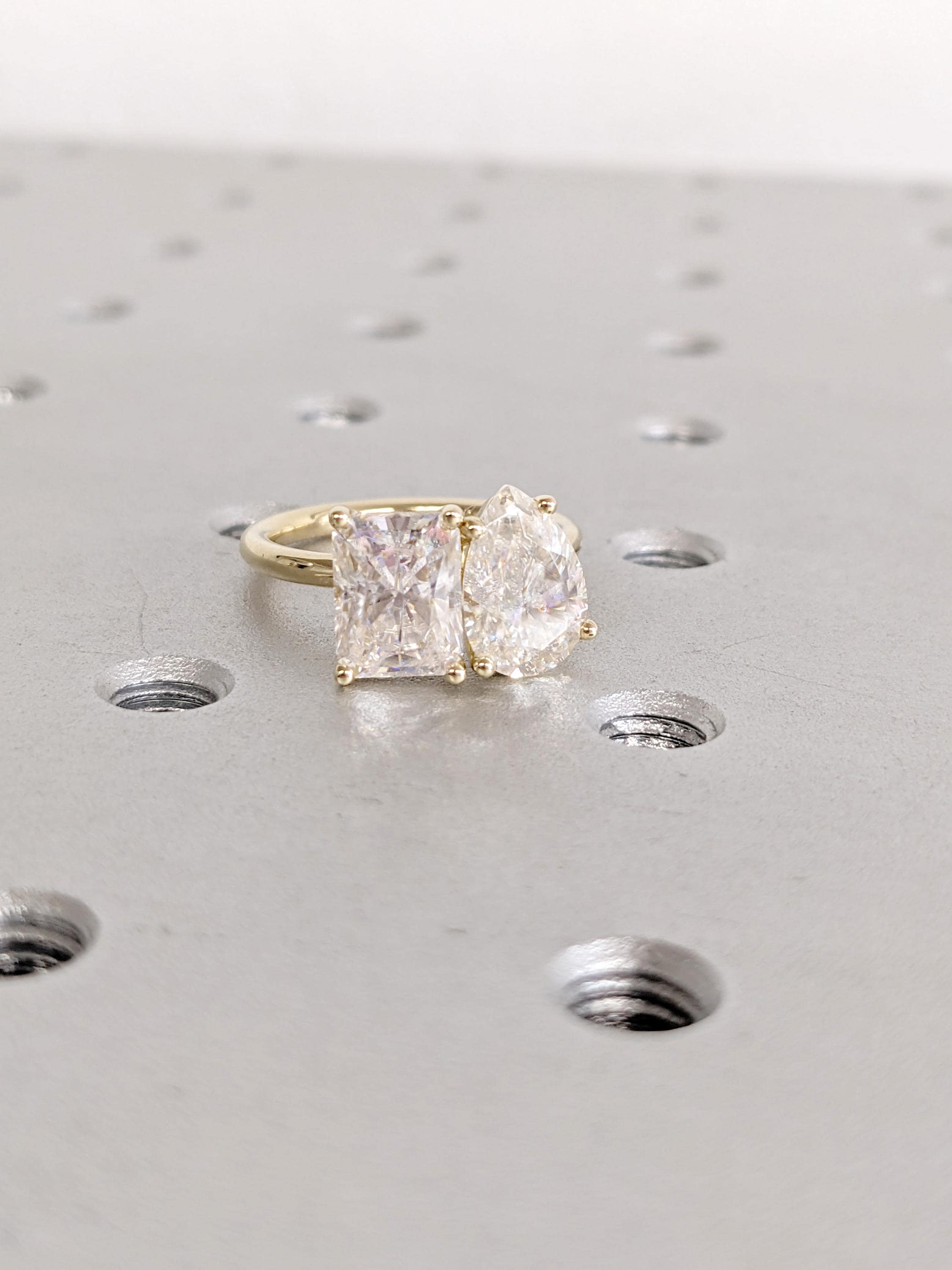 This Two Stone Moissanite Ring pairs a radiant Moissanite and a pear Moissanite in a prong setting, creating a bright duet of sparkle with a modern yet romantic look. The clean band draws attention to both stones, making this design perfect as an engagement ring, promise ring, bridal gift, or elegant everyday piece.