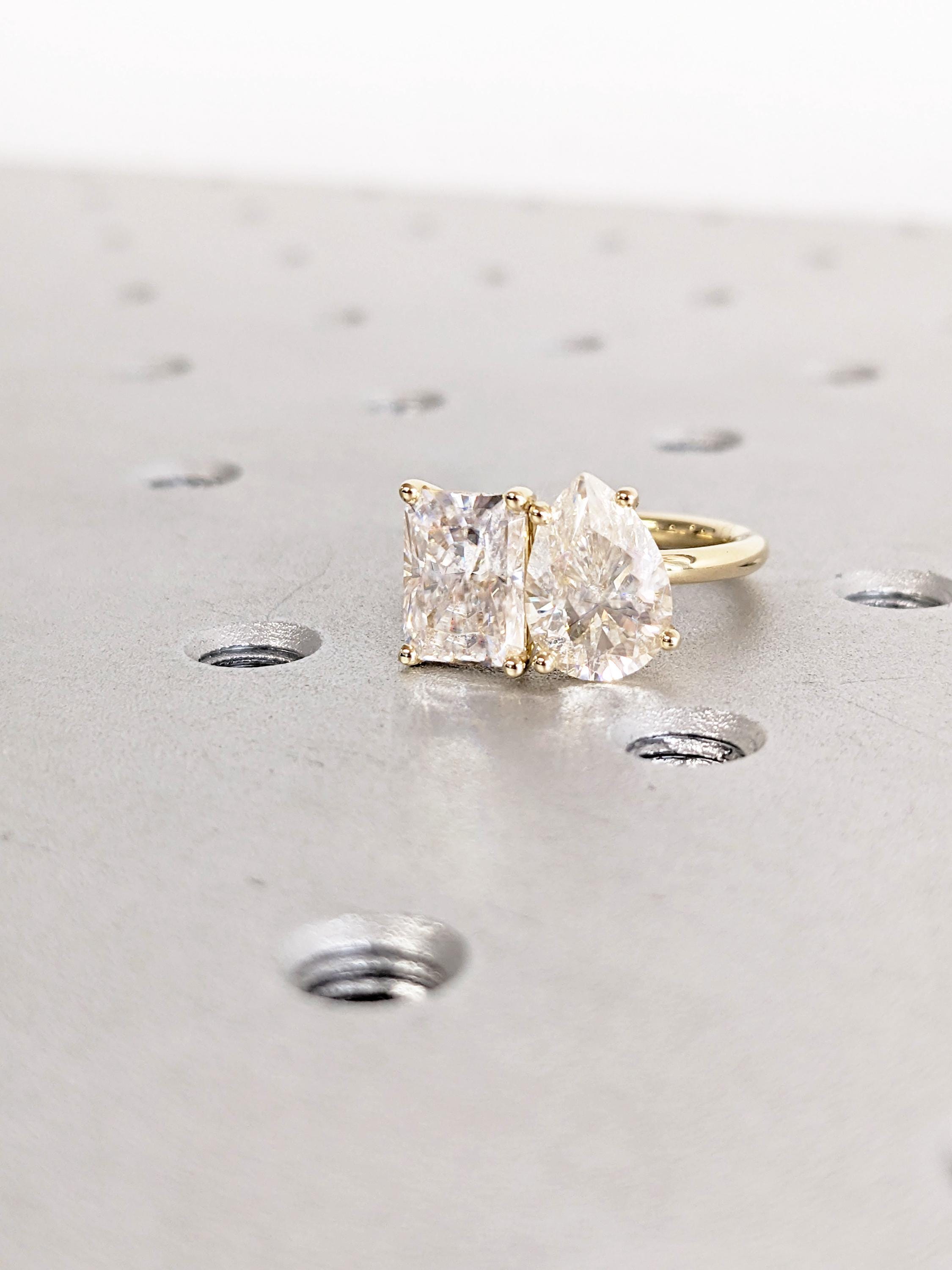 VVS Moissanite Engagement Ring: 14K Yellow Gold Pear Radiant Cut Double Stone Ring