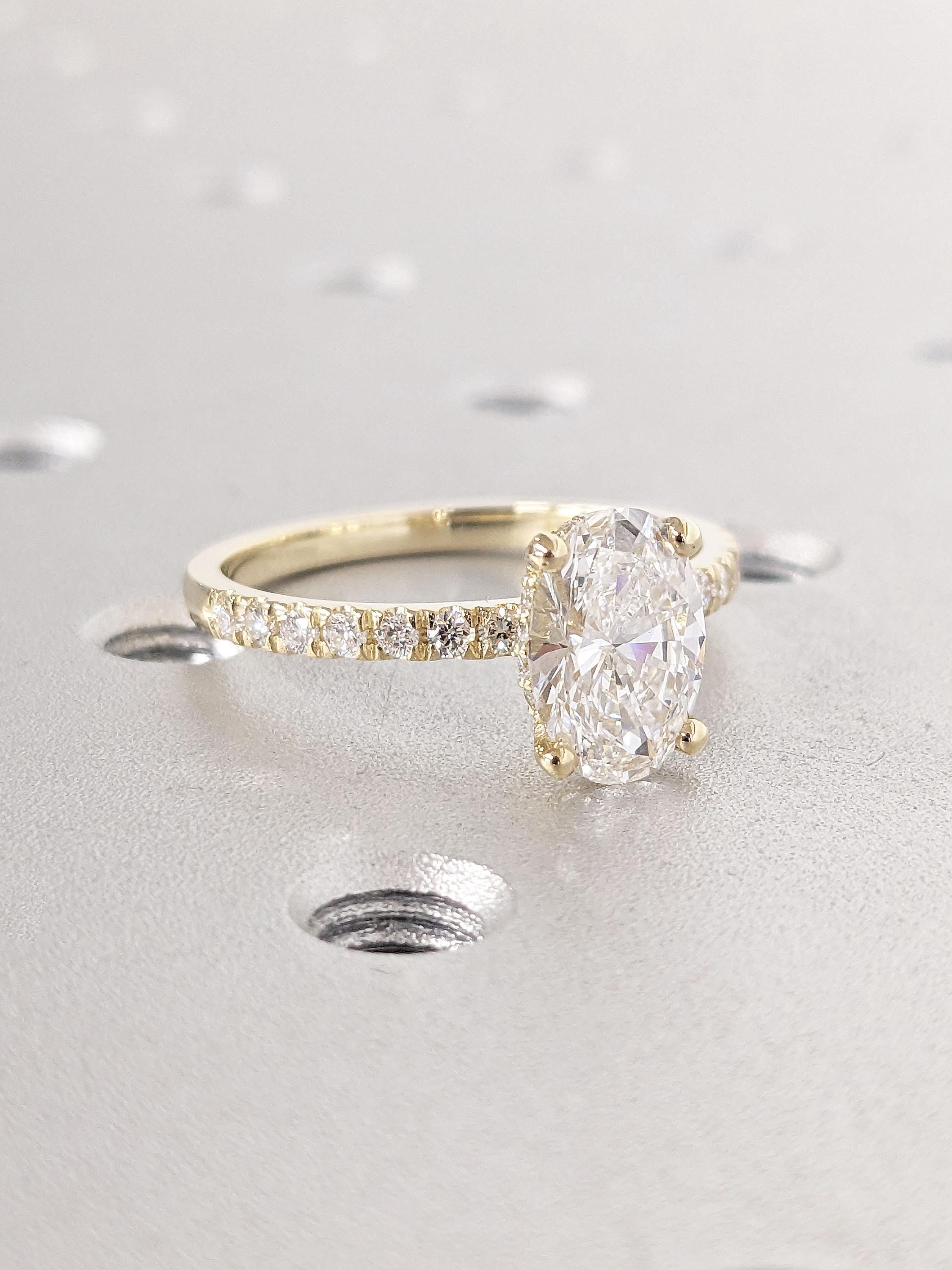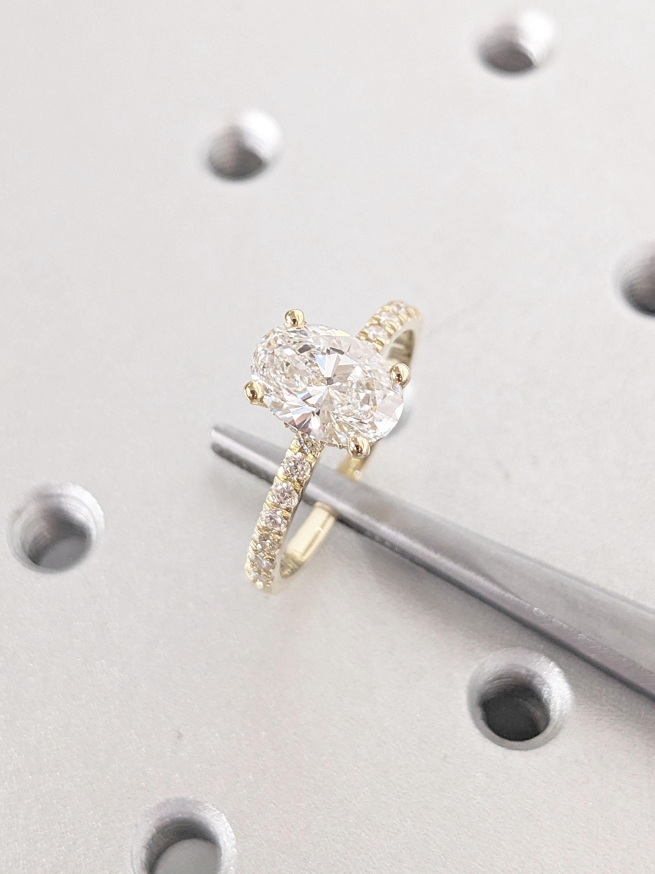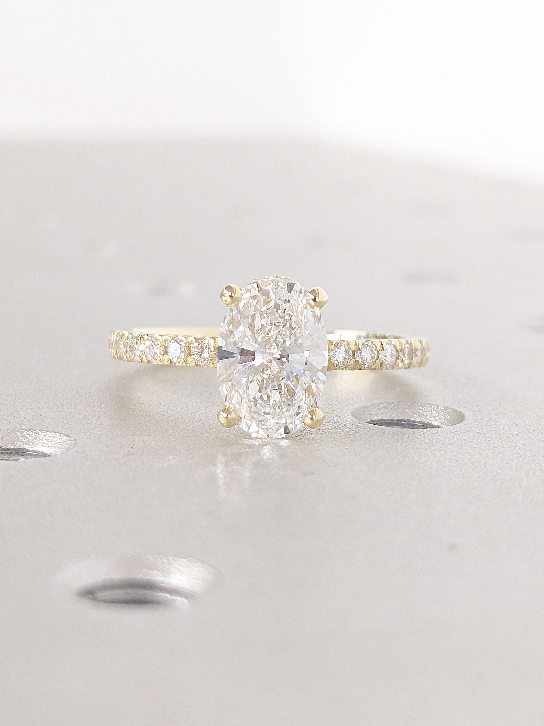 A handmade classic design, this luxurious ring features an oval cut Moissanite center, atop a dazzling hidden halo. Set on a dainty half eternity band of 2mm width, paved with natural diamonds, lab created diamonds or moissanites. Sparkling and elegant, this fine piece of jewelry is the perfect gift to celebrate your love story, or as a token of appreciation for that special woman in your life.