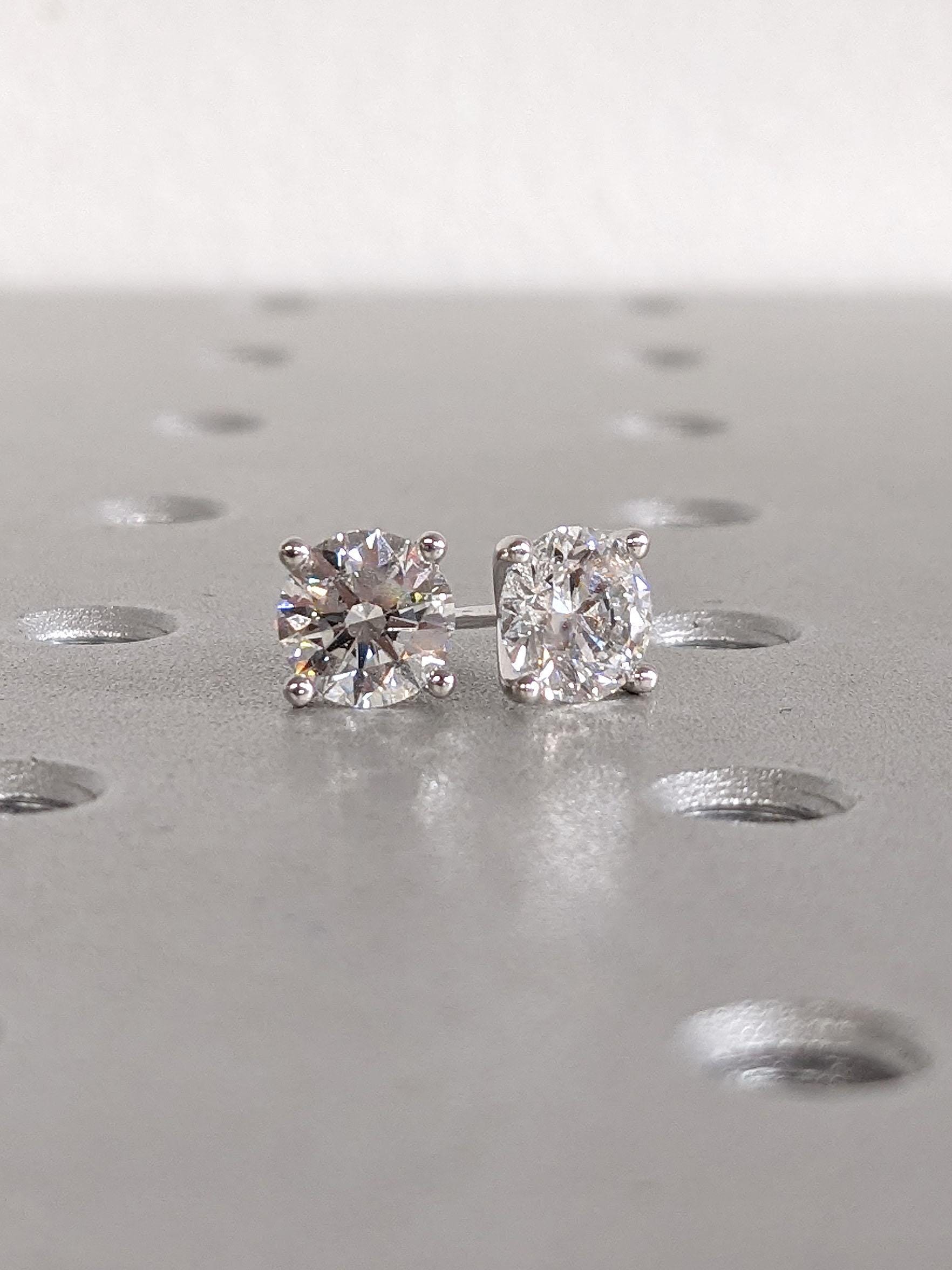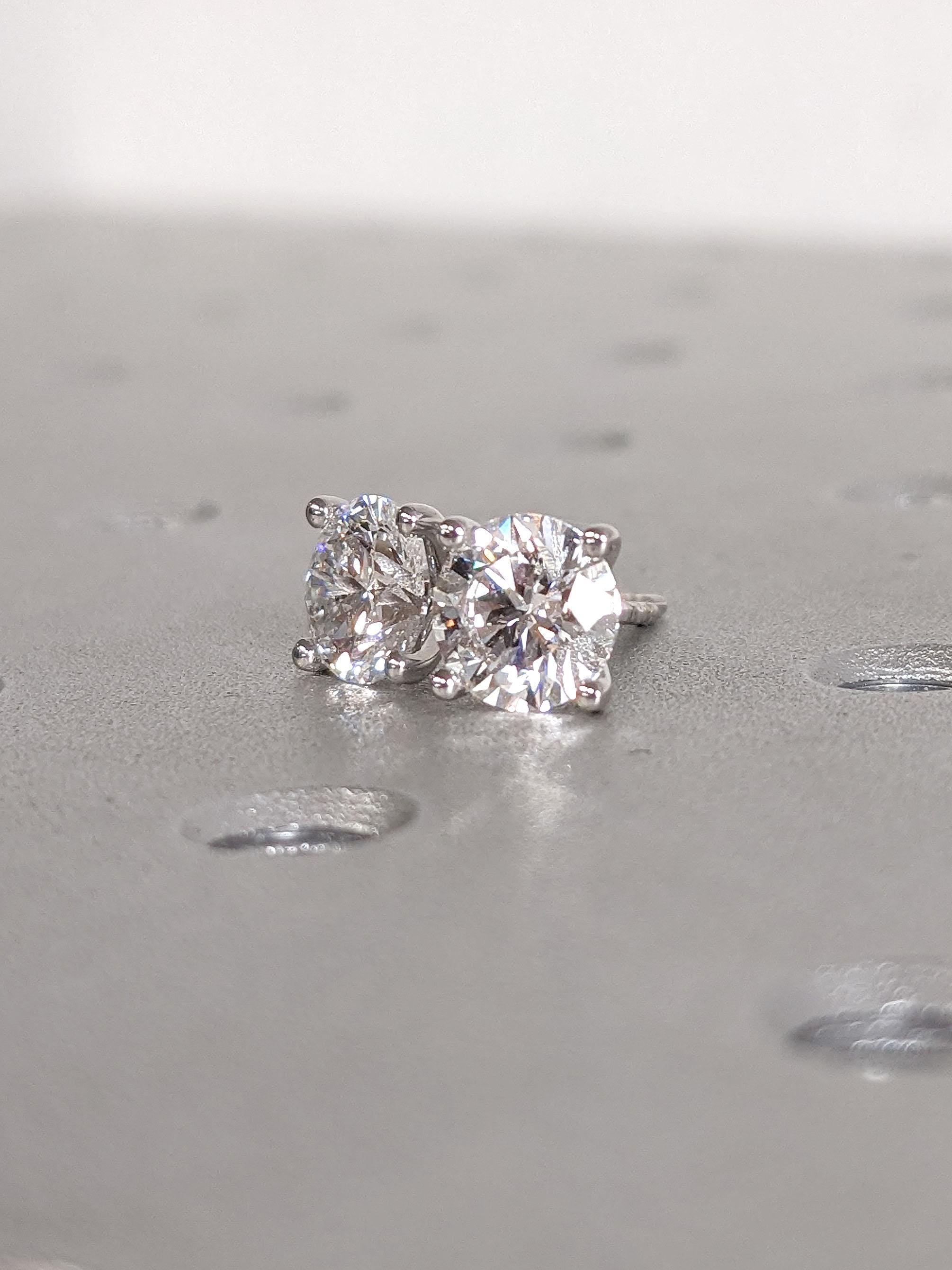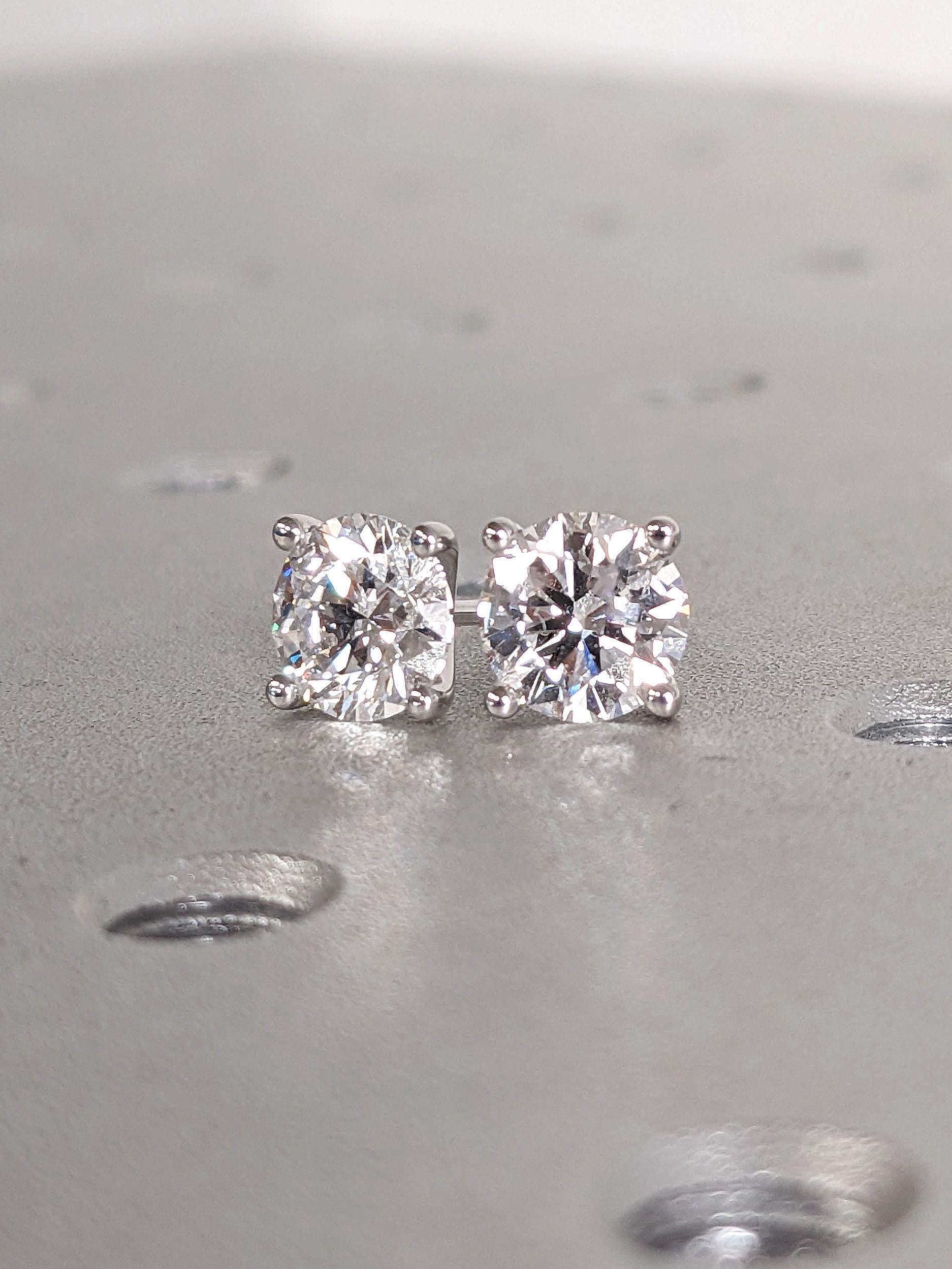 These classic stud earrings feature round cut Moissanite set in a sleek four-prong martini basket, offering maximum light entry and brilliant sparkle. Finished with secure push-back closures, they’re a timeless everyday essential—minimal, elegant, and effortlessly luminous.
