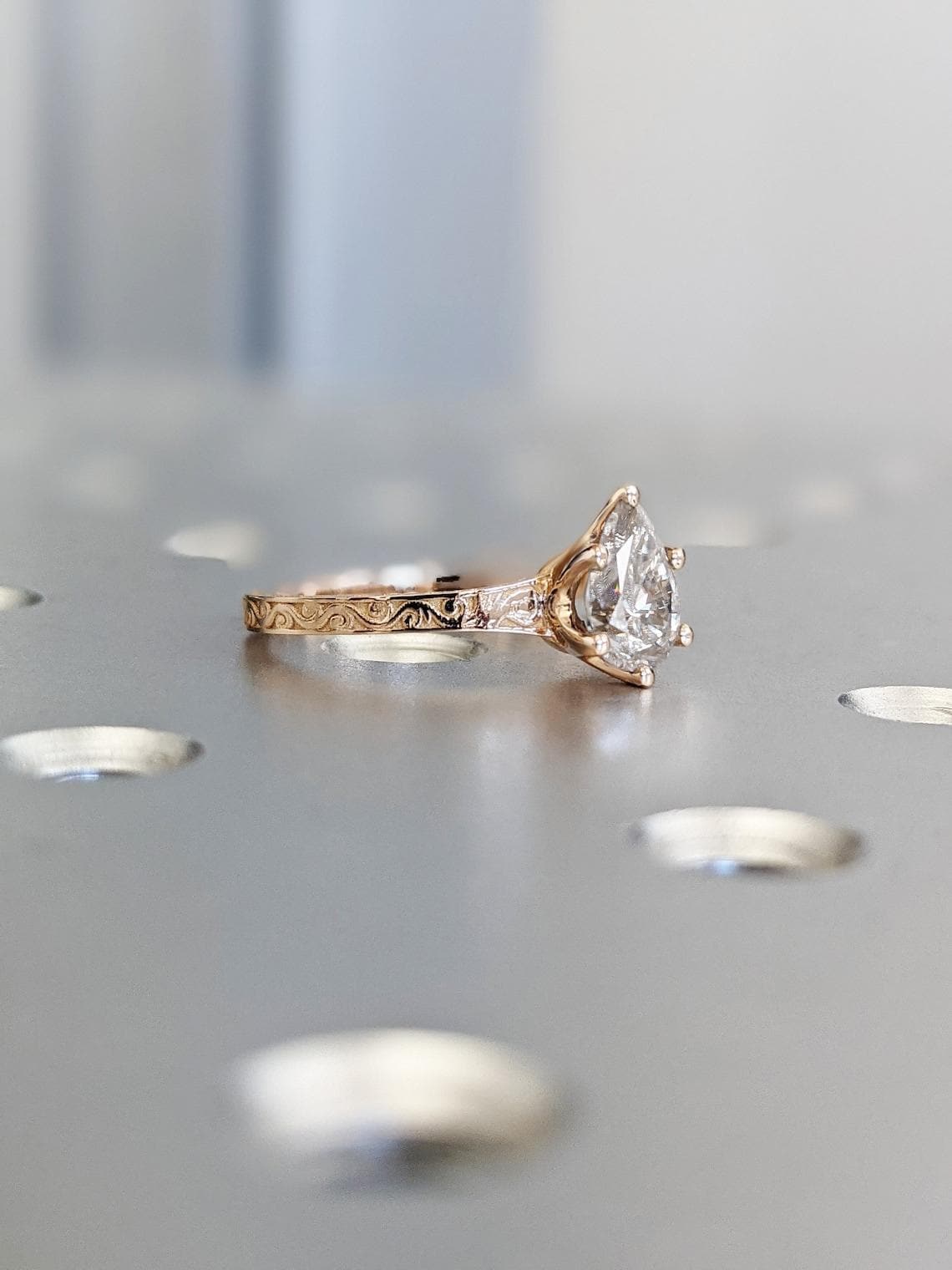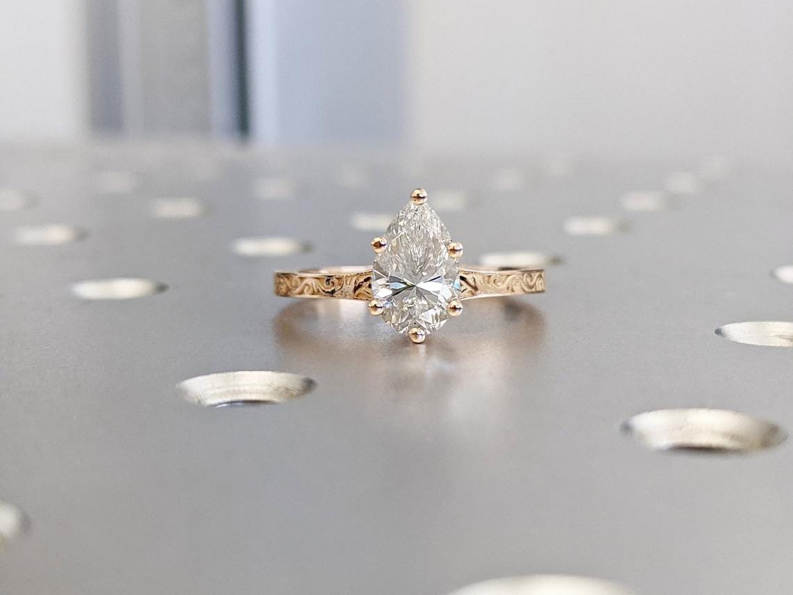 Make a statement of timeless elegance with our antique-inspired engagement ring, featuring a pear cut Moissanite set in a secure basket setting. The intricate details of undulating filigree waves on the square-shaped band add a vintage touch, making this ring a stunning choice for your special moment.