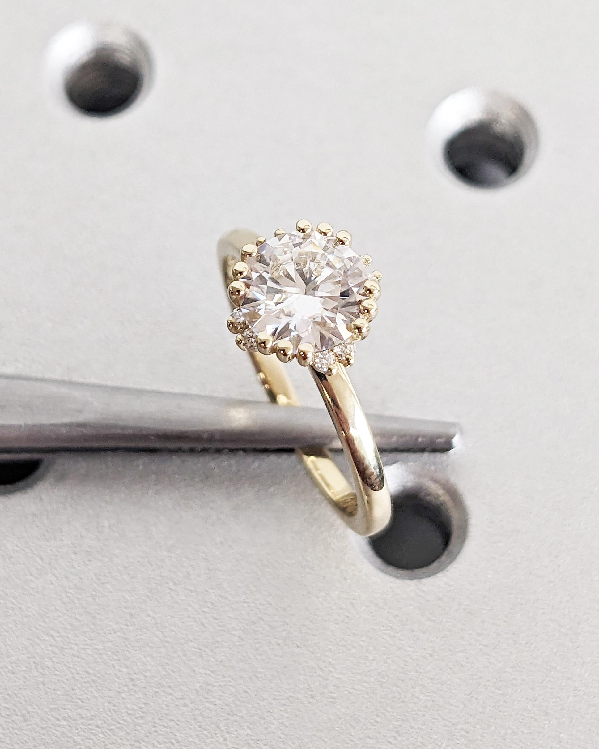 A beautiful round cut moissanite takes center stage in this ring, nestled in a unique triple prong basket setting and framed by eight side stones, creating a delicate starburst design. Choose from natural diamonds, lab diamonds, or moissanites for the side stones to make this ring truly one-of-a-kind. Inspired by floral elements and the starry elegance of starlit skies, this ring is a timeless symbol of unity and a love that shines endlessly bright.