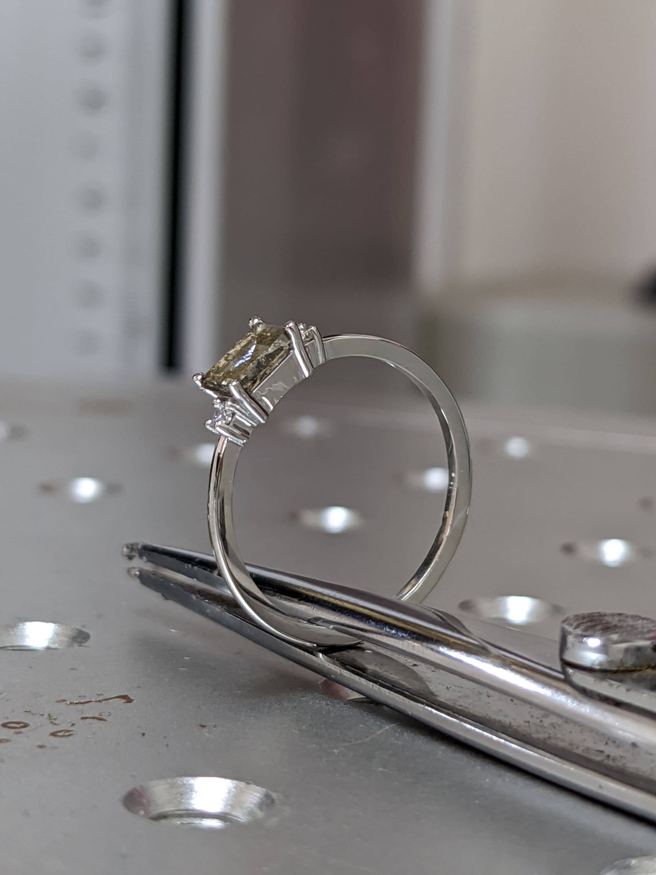 A stunningly beautiful vintage inspired design, petite band with a baguette cut Salt & Pepper diamond, adorned by 2 beautiful diamonds to contrast the center diamond.