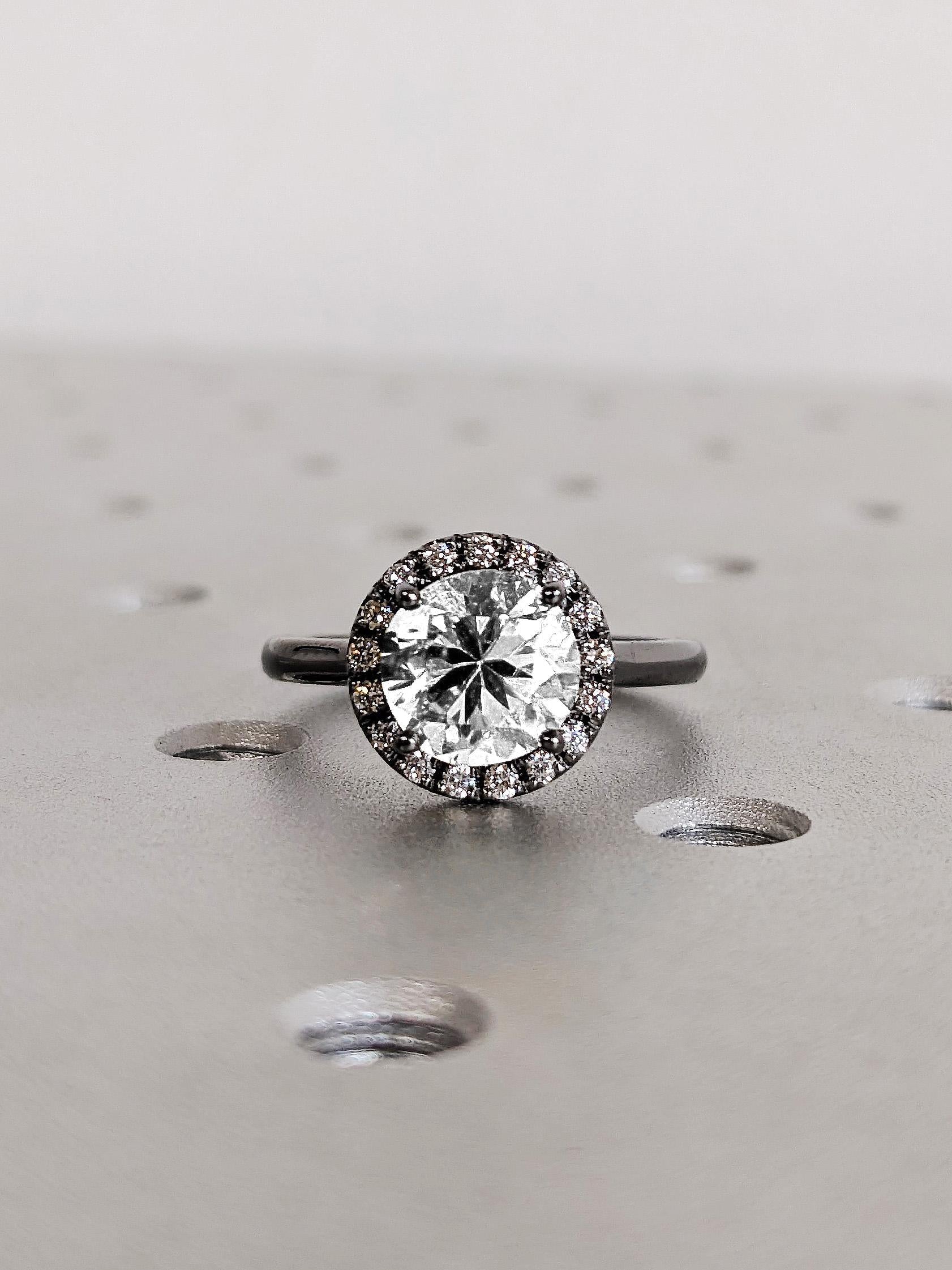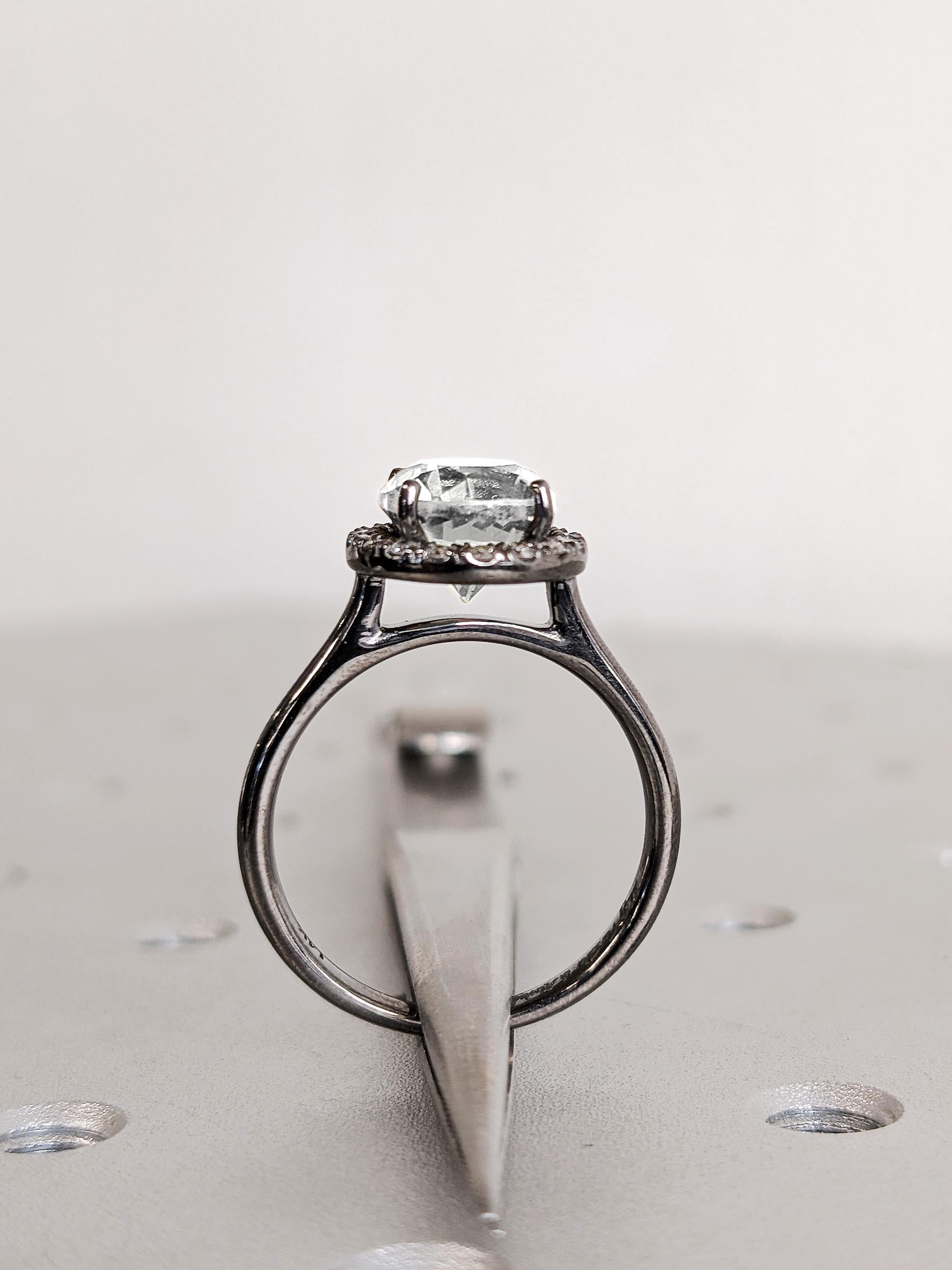 White Moissanite Engagement Ring: Round Cut Diamond Halo, 14K Solid Black Gold Wedding Band