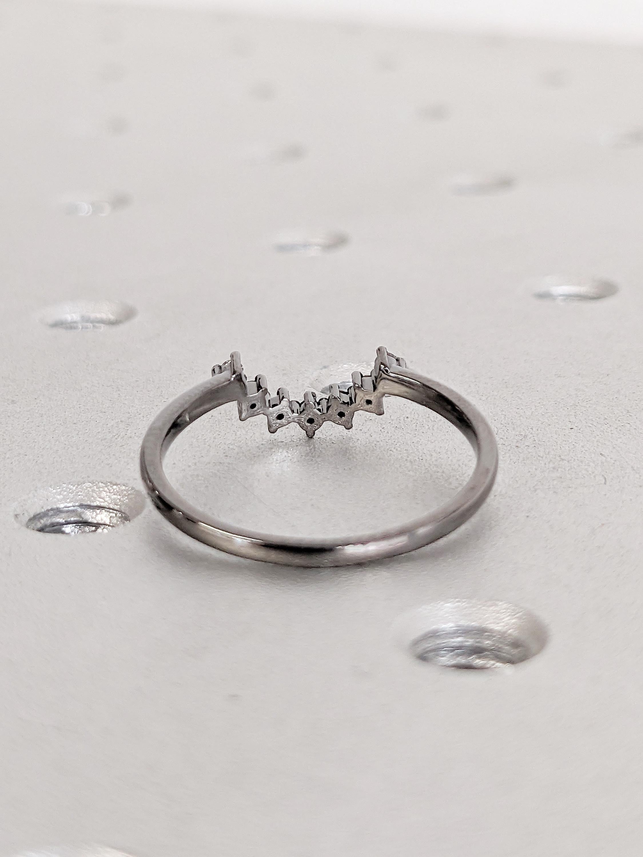 This unique curved wedding band is adorned with a row of shimmering round Black Diamond accents, gracefully set along the slender band. Its subtle curve is designed to complement an engagement ring beautifully, while the striking black diamonds bring a modern yet timeless touch to its vintage-inspired charm.