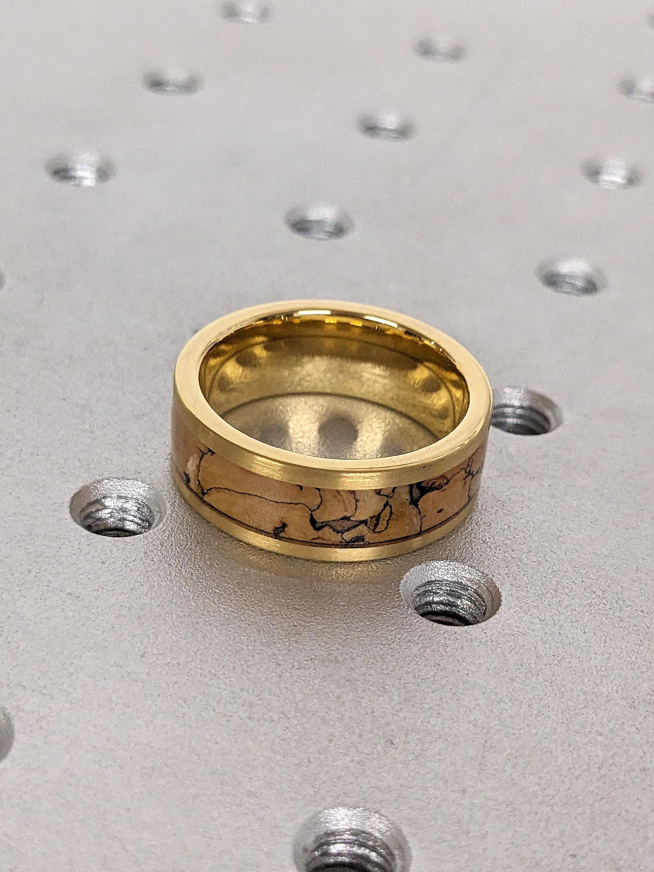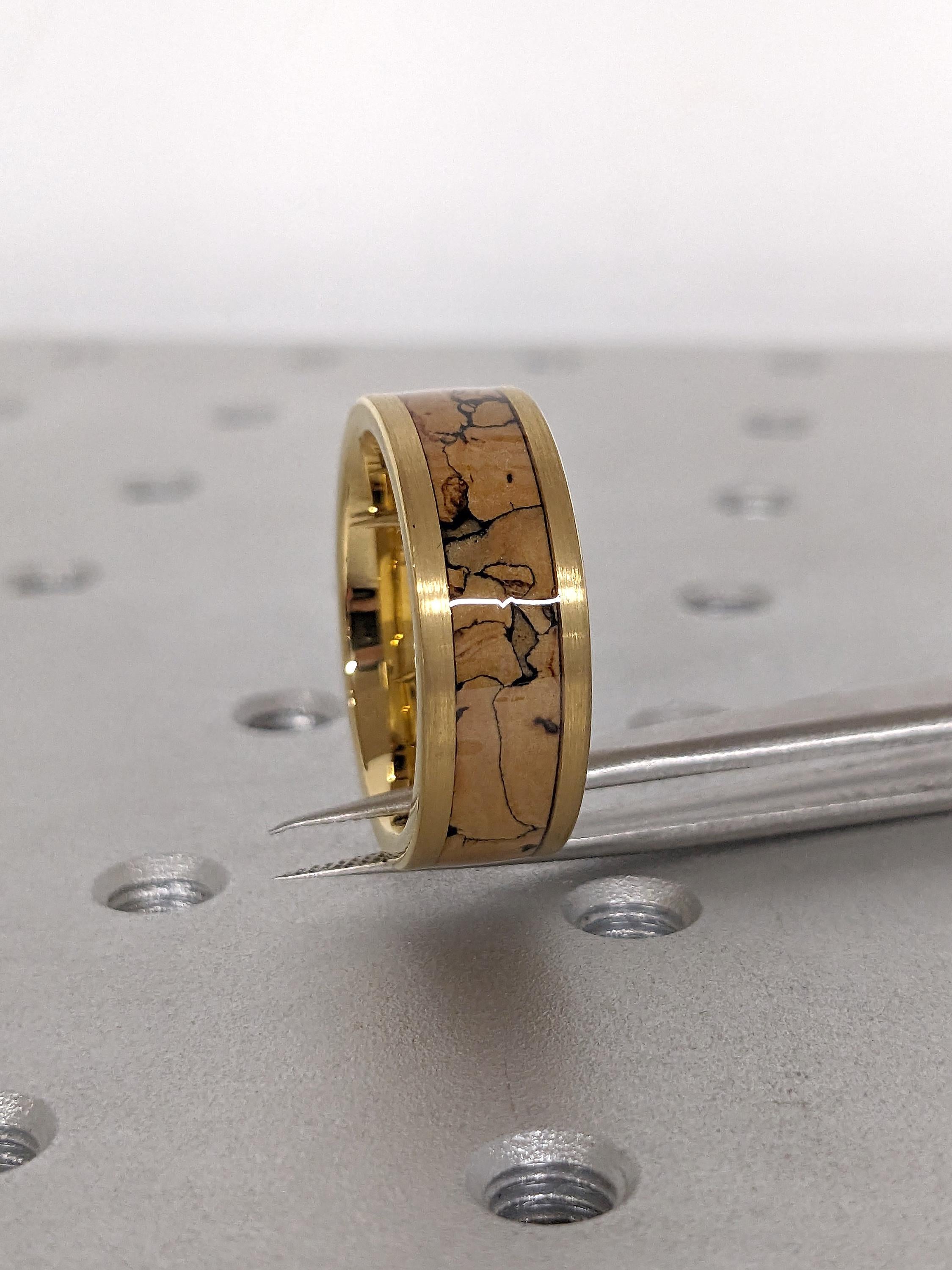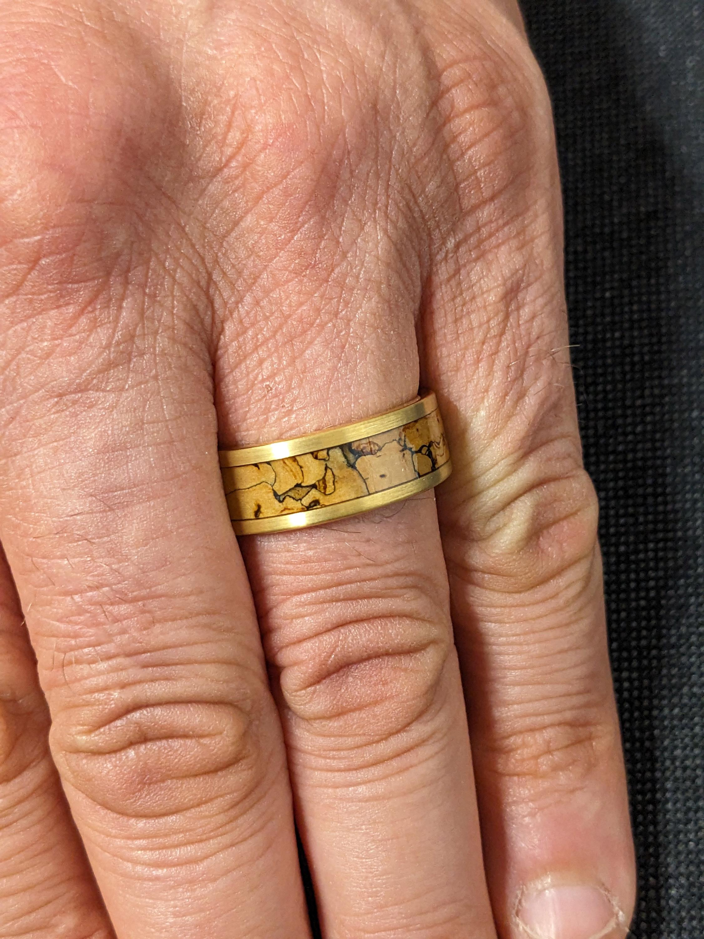 Bold and distinctive, this 8mm yellow gold plated tungsten ring stands out with its striking man-made dinosaur bone inlay pattern — a modern interpretation of prehistoric texture and timeless strength. The brushed matte finish adds a rustic, masculine edge, while the tungsten carbide construction ensures lasting durability and scratch resistance. Designed for comfort and individuality, this ring makes a powerful statement for the modern man who values both character and craftsmanship.